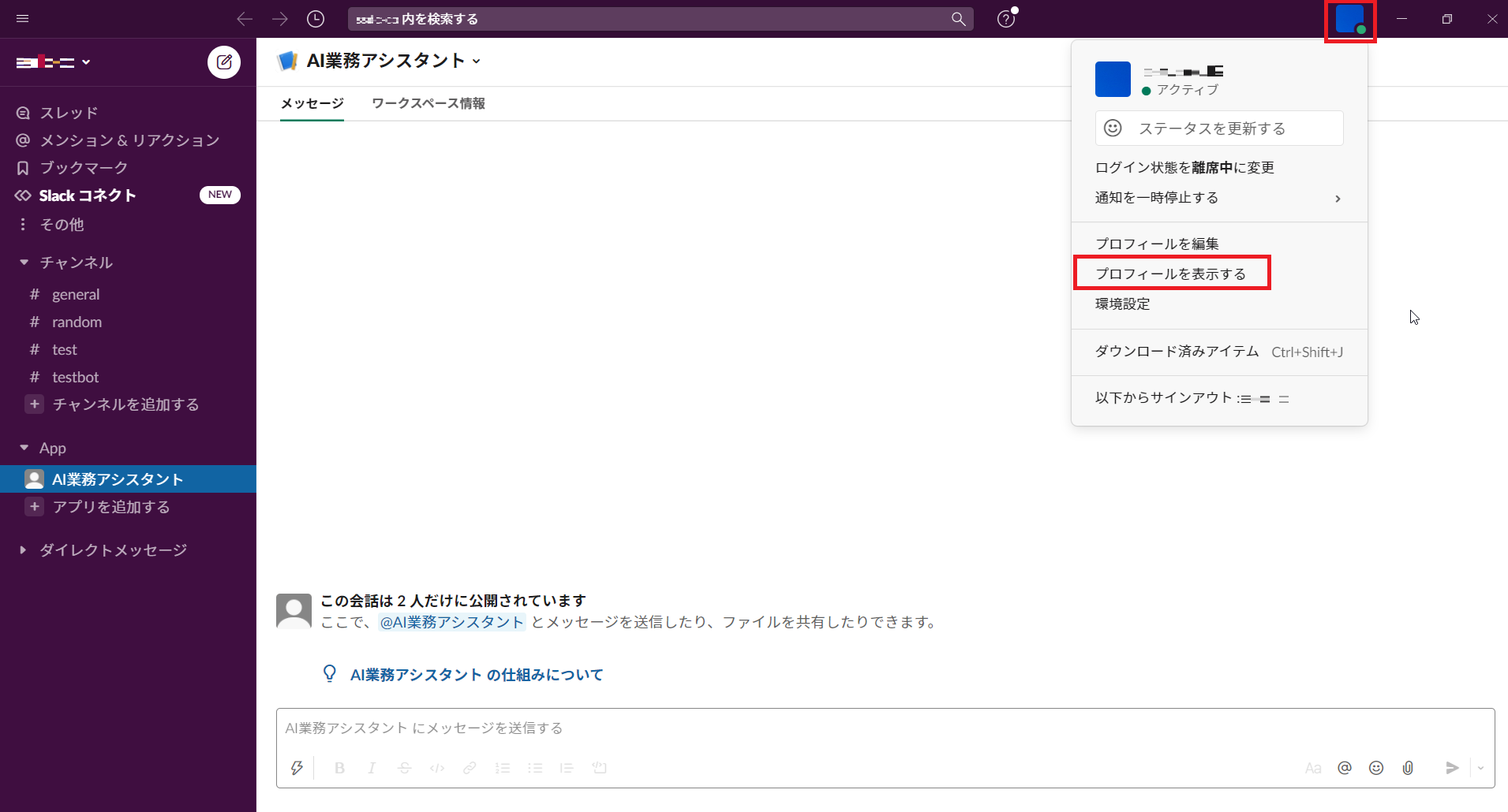 [ボット プロファイル] ページが表示されます。必要に応じアイコンと表示名を変更します。