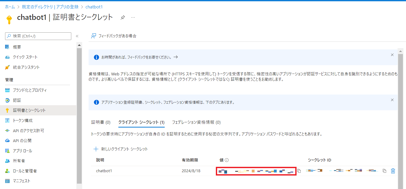 同画面の左メニューから「証明書とシークレット」をオープンし、クライアントシークレットタブの新しいクライアントシークレットをクリックします。