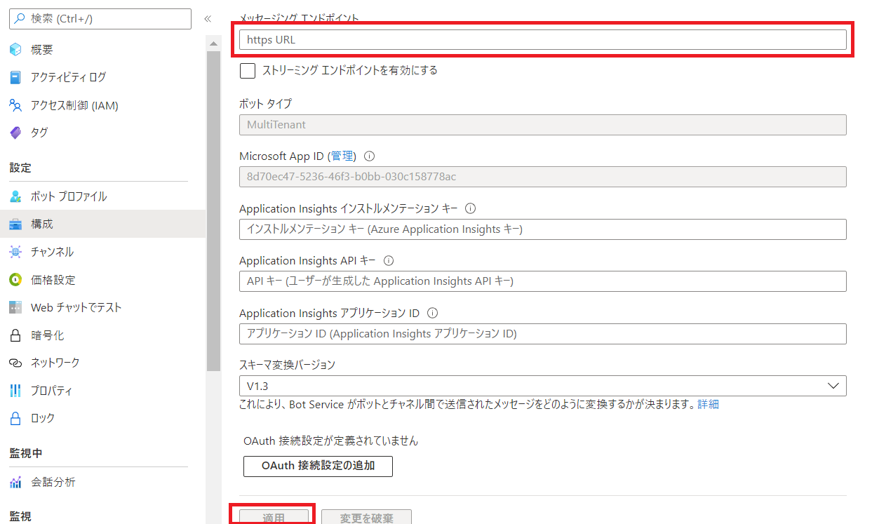 CBシリーズの管理画面を開き、設定>TEAMS設定のメッセージングエンドポイントをコピーし、azure側の画面に登録します。