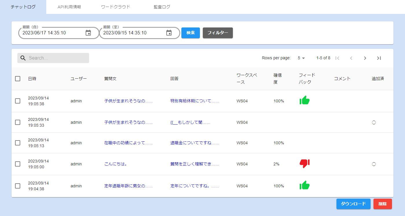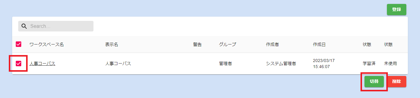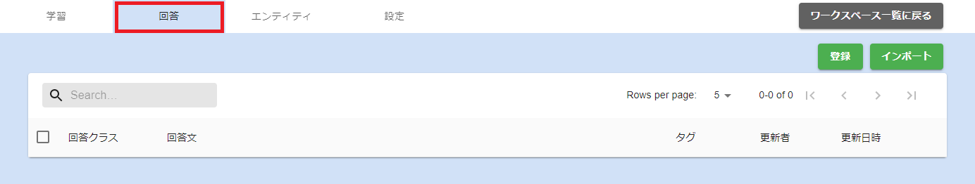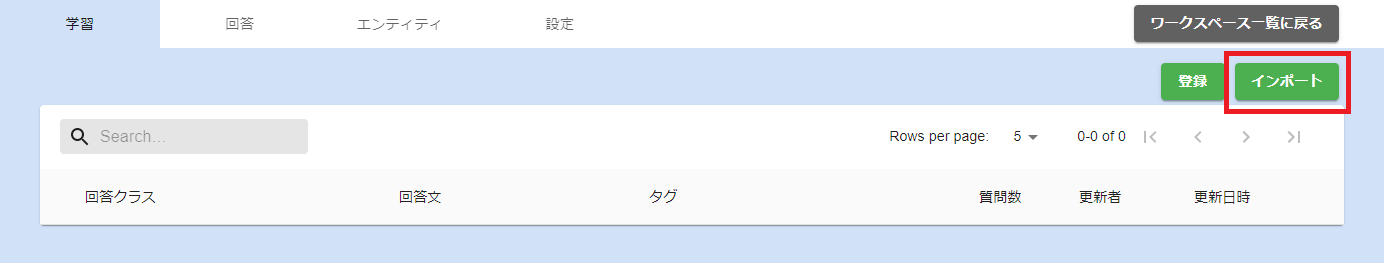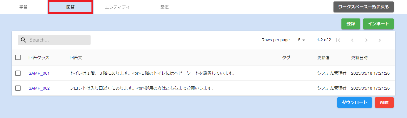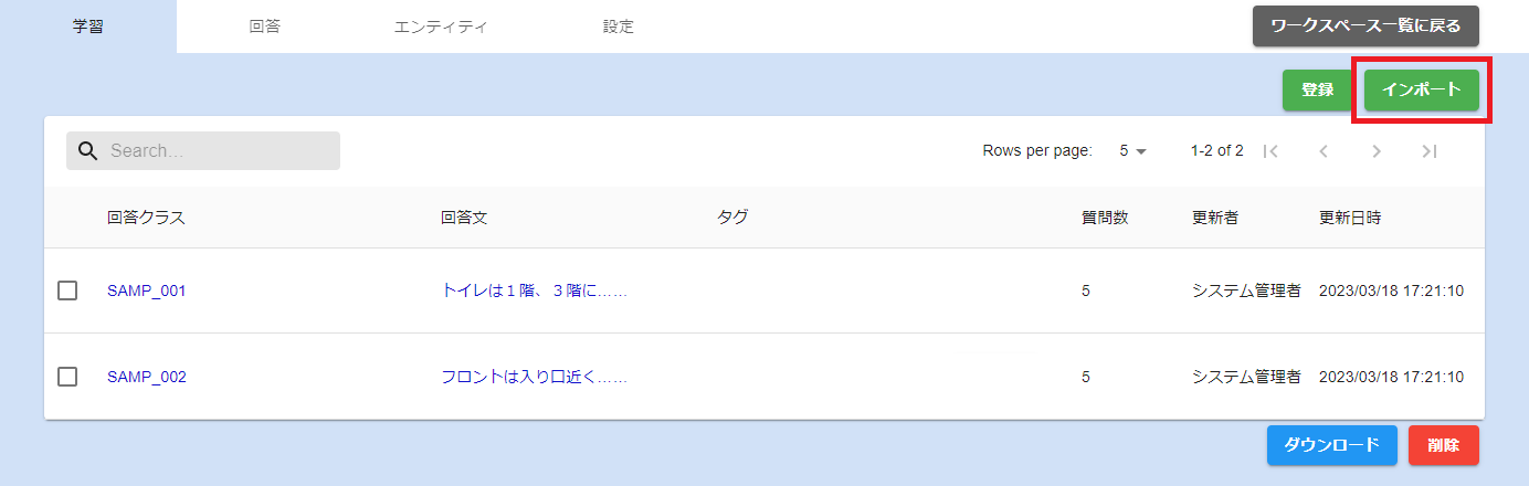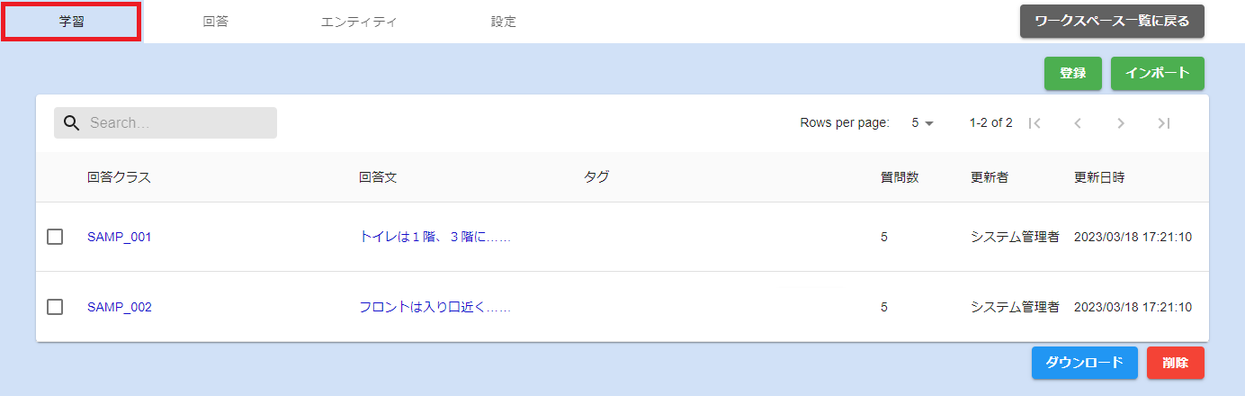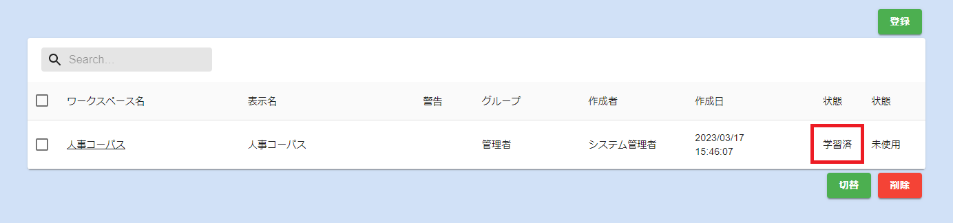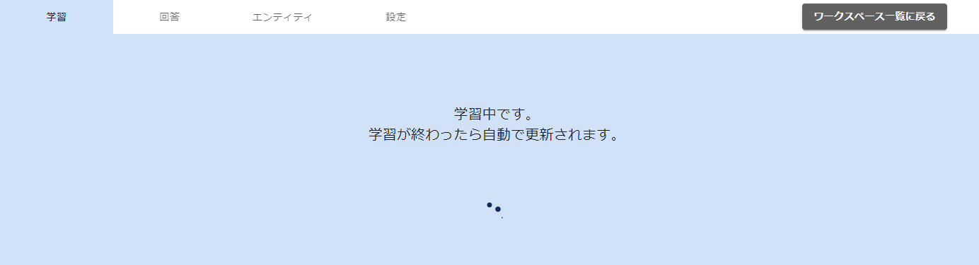 ※ワークスペースの状態が「学習済」、回答データ登録作業の「完了」をもって、新しい学習データが使用可能となります。