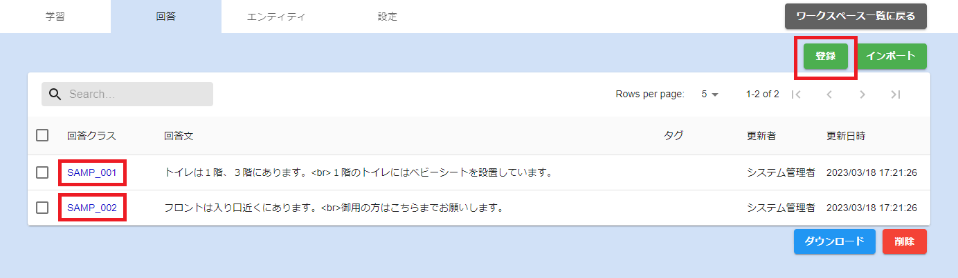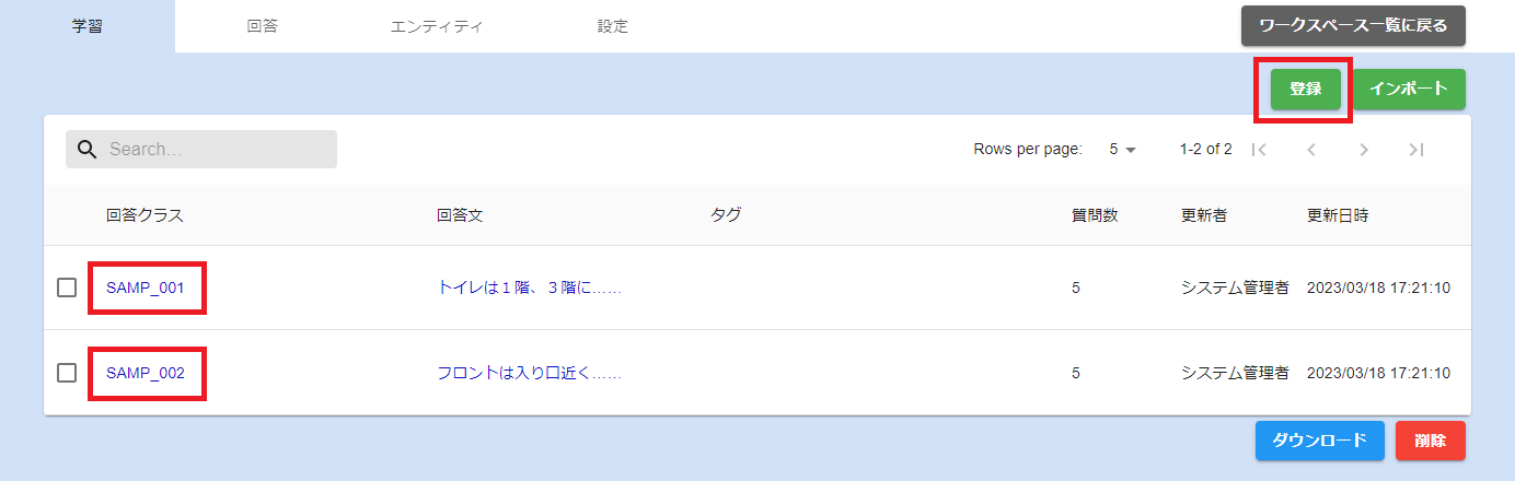 学習データ一覧画面にて、修正する回答クラスをクリックし、登録画面を表示します。