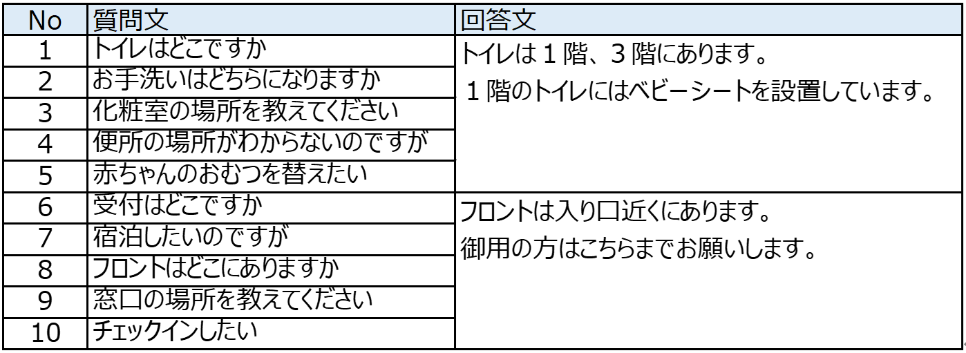 ※最低5つ、できれば10個以上が望ましいです。例)トイレの場所を質問する場合の質問群