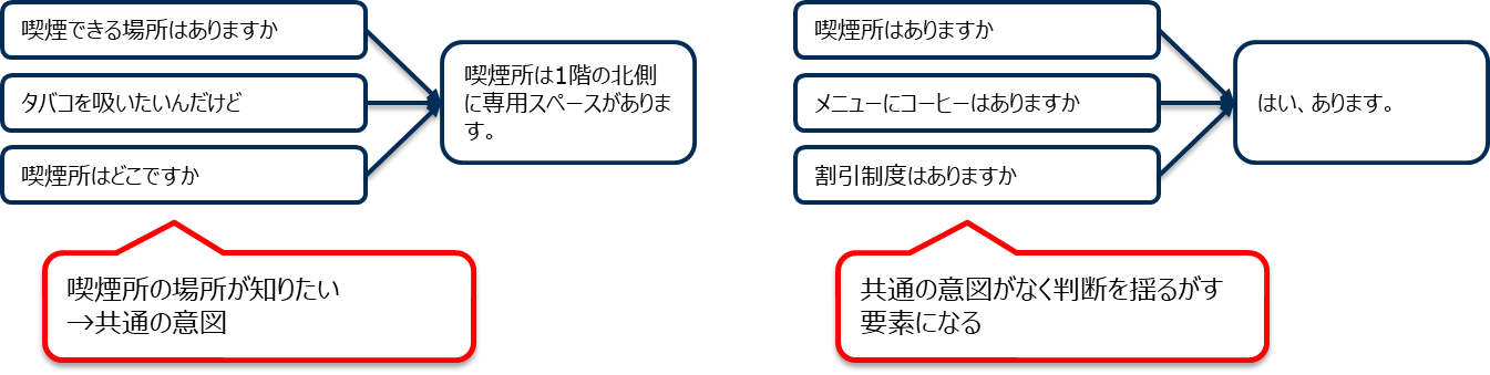 チャットボットは同じ回答クラスに紐付かれる複数の質問の共通の意図を理解して判断するので、