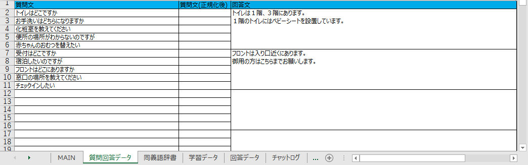- 「質問回答データ」シートの末尾に回答文を追加し、質問文に質問を設定します。