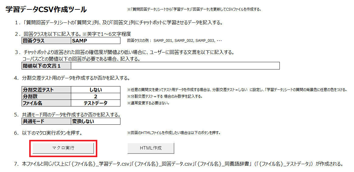 コーパス学習データ作成ツールの「MAIN」シートの学習データCSV作成ツールのマクロ実行ボタンをクリックし、CSVファイルを出力します。
