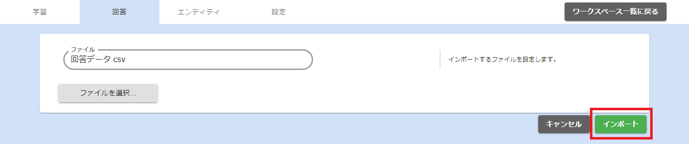 回答データインポート画面にて、再学習データの作成で作成した回答データを選択します。