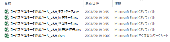 コーパス学習データ作成ツールと同一のフォルダに、学習データCSVファイルと回答データCSVファイルが出力されます。