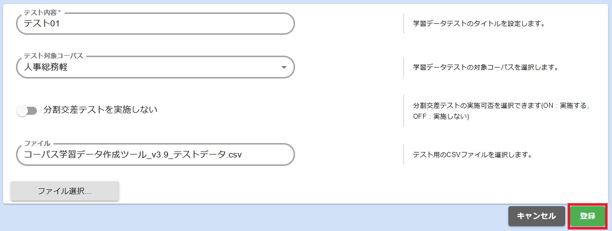 学習データインポート画面にて、ファイル選択をクリックして再学習データの作成で作成したコーパス学習データを選択します。