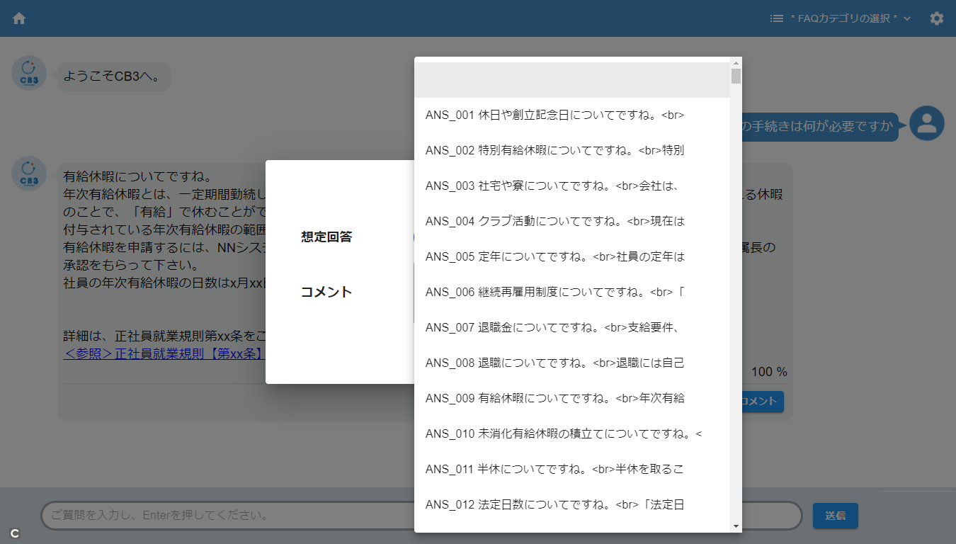 回答データ一覧画面にて、更新する回答クラスをクリックし、回答文更新画面を表示します。