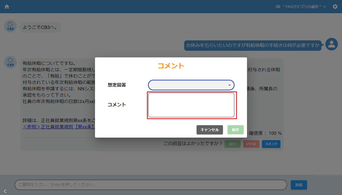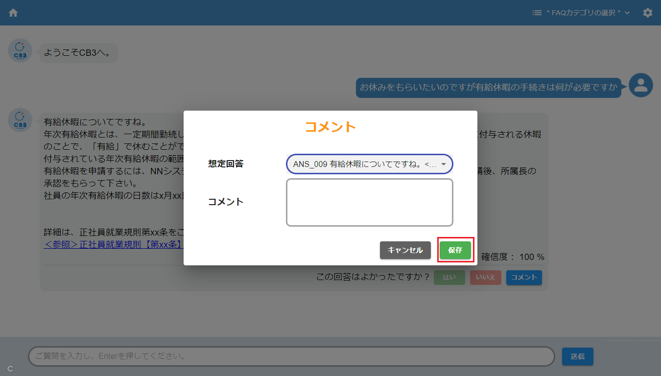 学習用質問文入力欄に登録したい質問文を入力した後、登録ボタンをクリックします。 - 学習データの更新