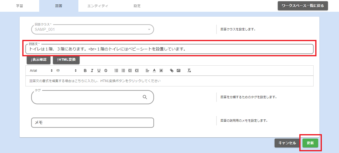 質問文更新画面で質問文入力欄に上書きする質問文を入力した後、更新ボタンをクリックします。 - 学習データの削除