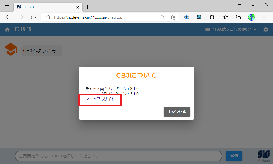 右上のメニューから「CB3について」(製品名ごとに異なります)をクリックし、出てきたダイアログのリンクをクリックするとマニュアルサイトを表示します。