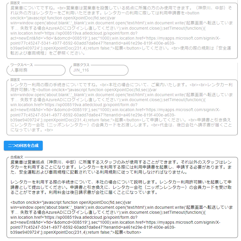 類似している回答文を確認することができます。必要に応じて回答を統合することで回答精度を向上させ、チャット利用者が求める回答にたどり着きやすくなります。